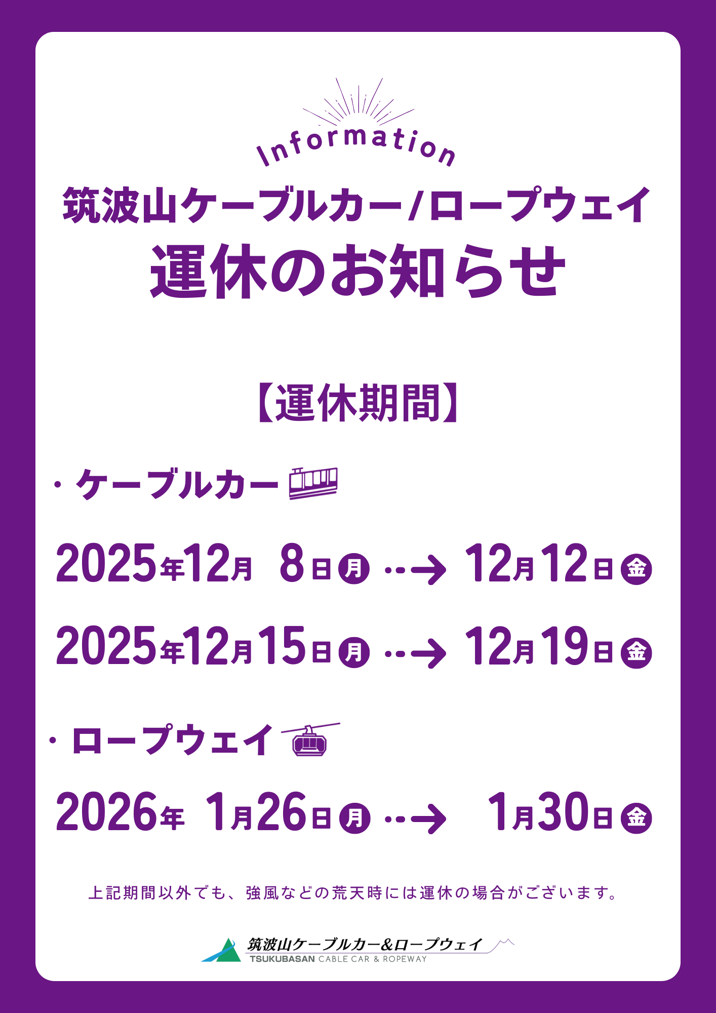 2025年12月3日 / 最終更新日 : 2025年12月3日 admin 協会からのお知らせ ケーブルカー・ロープウェイ定期検査・設備更新工事による運休のお知らせ 筑波山ケーブルカー・ロープウェイについて詳しくはこちらから