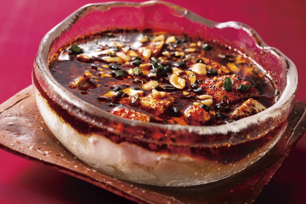 豆腐(土浦十二屋使用)やひき肉など塩味ベースで煮込み、器に注ぎ上から唐辛子や山椒、福来みかん(陳皮)を熱した油をかけ、香りを存分に立たせ提供。福来みかんの爽やかな香りと辛さのハーモニーをお楽しみください。