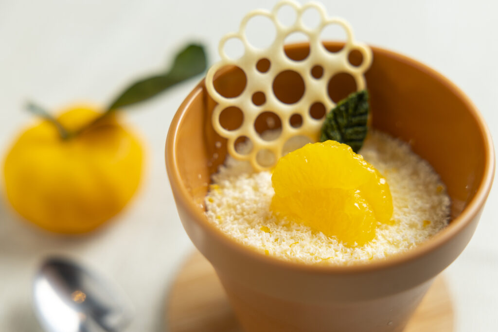 福来みかんの生皮を刻んで、はちみつ漬けに。小麦にも福来みかんパウダーを含ませて、甘みと一緒に香りをお楽しみいただけます。