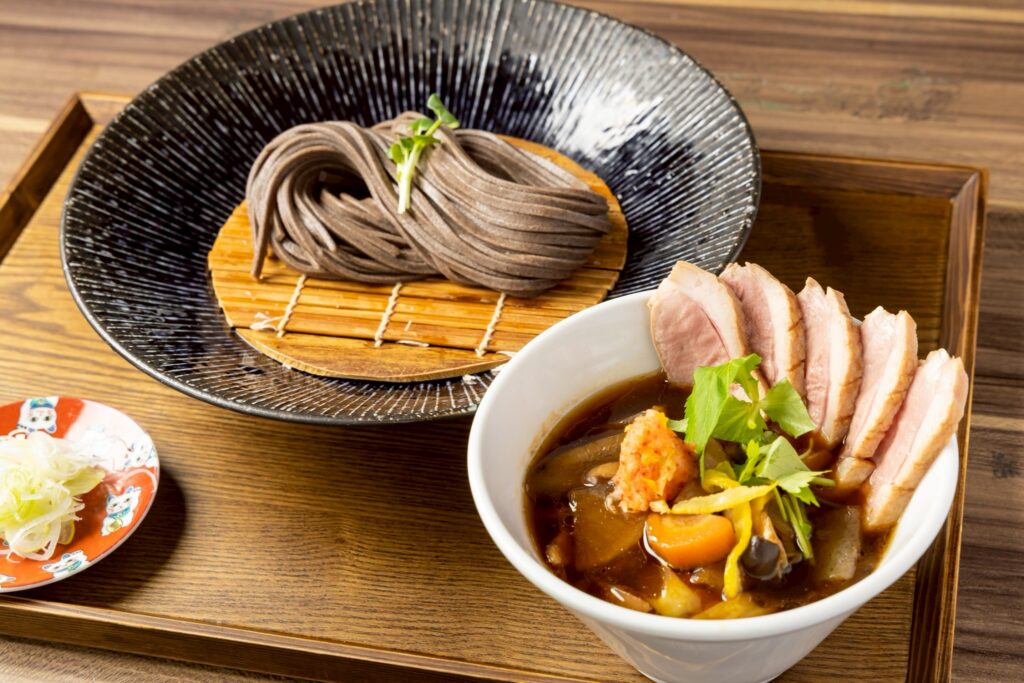 茨城名物「けんちんそば」に、鴨の旨味を重ねた特製つけ汁。当店自慢の太切り生そばが、その濃厚なコクをしっかり受け止めます。
