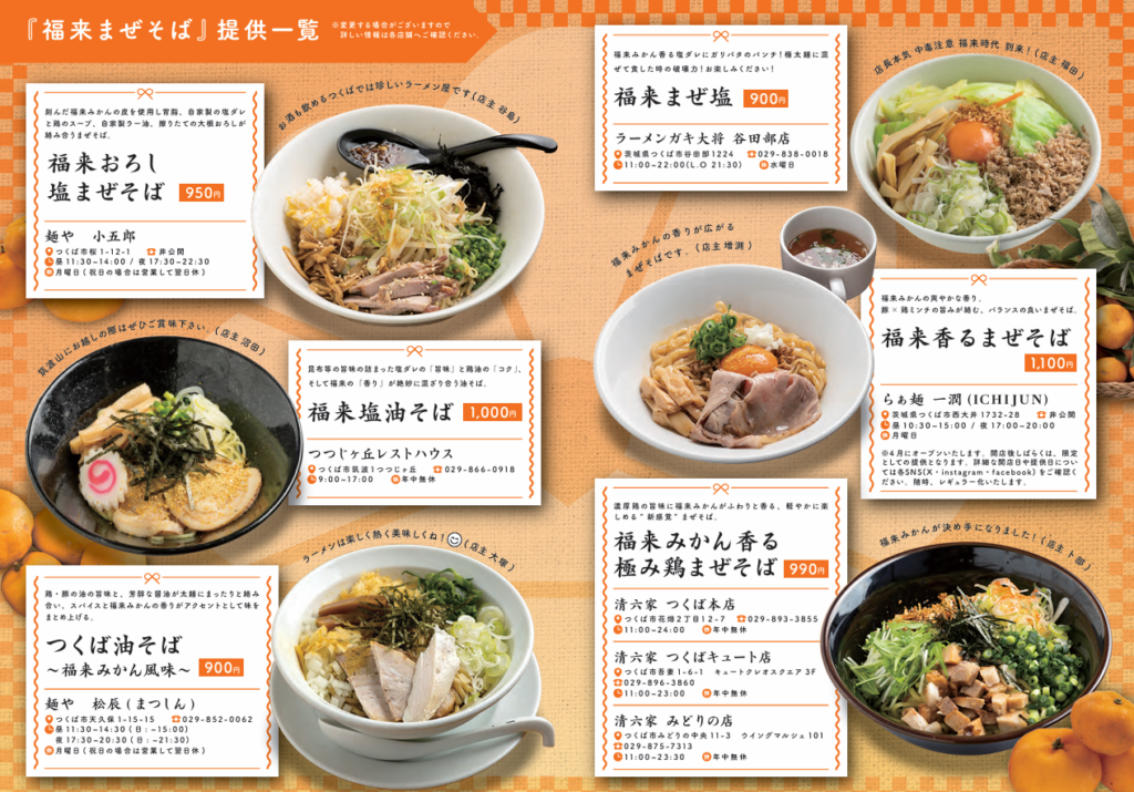 ●期間限定イベント「つくば福来らーめん紀行」を1,8月に開催し、福来みかんを使用した限定メニューをチラシ・ポスター・SNSでPRします!